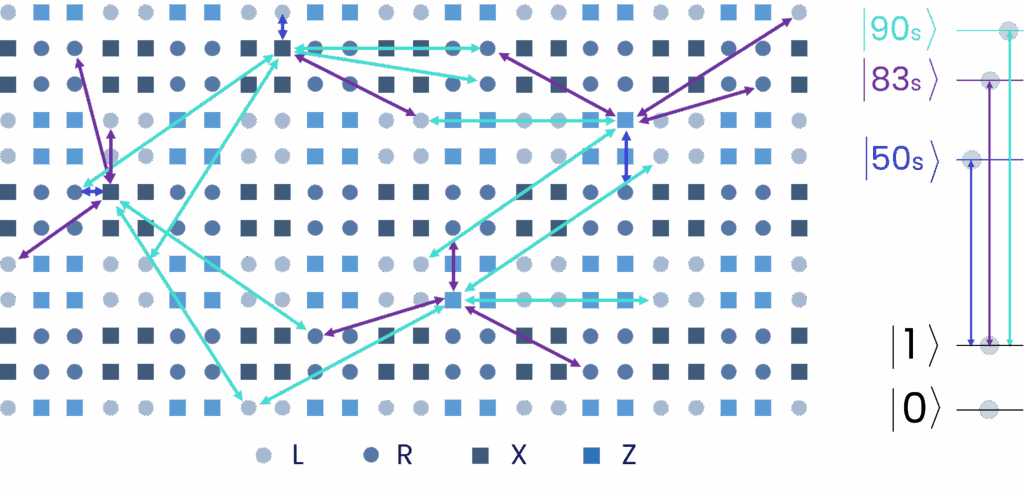 Quantum information is stored in the atoms’ internal energy levels, referred to as “clock states” in cesium atoms. These states act as the |0⟩ and |1⟩ qubit values.